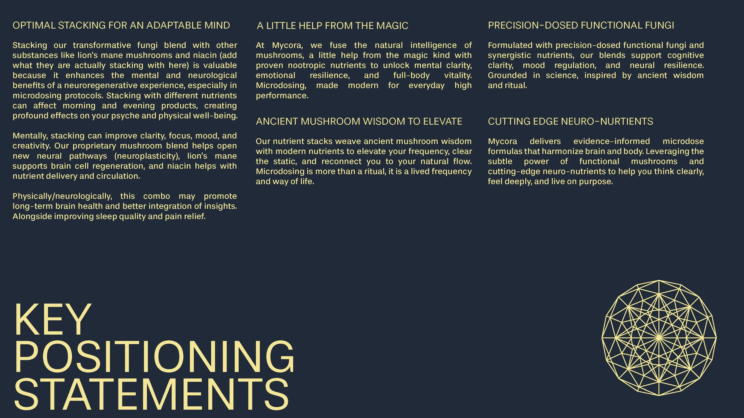 For Mycora Medicinals, a wellness brand rooted in the science of fungi and plant-based nutrition, I led the design of a comprehensive brand deck and label suite to elevate their visual identity. (Wordmark was designed by Benthouse creative.) Through soft desert tones, refined typography, and minimal, intentional design, the brand now conveys clarity, balance, and impact, mirroring Mycora’s focus on science-backed, plant-based wellness. The result is a cohesive identity system that gives the brand a confident, modern presence in the growing functional supplement space.