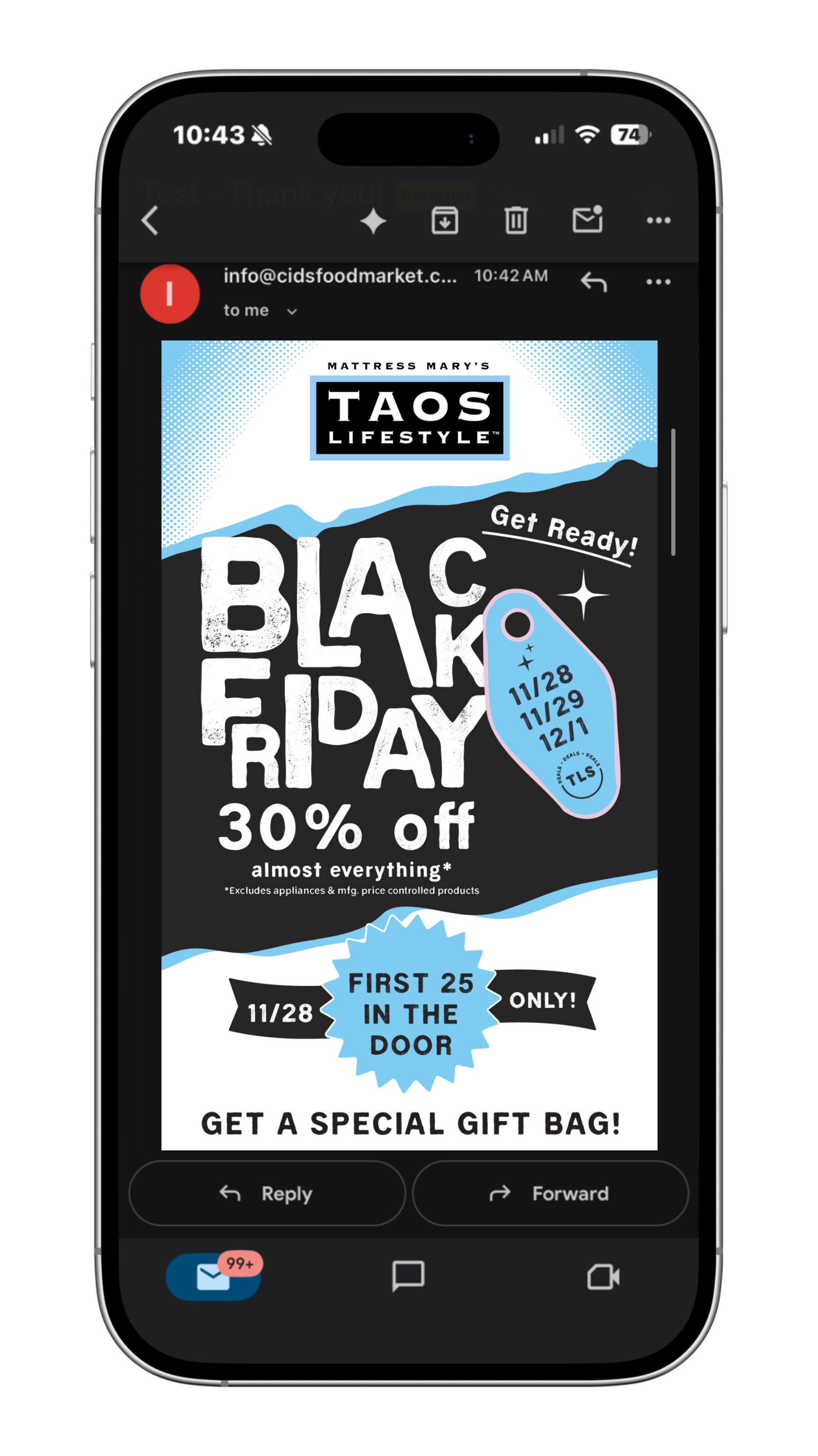 Working with Taos Lifestyle has been both a creative challenge and a rewarding collaboration, bringing a furniture, appliance, and home goods store to life in a way that feels engaging, approachable, and designed to drive sales through email and print. I led the design of their interior way-finding system and campaign-based tabletop signage. Throughout this portfolio, you’ll find a mix of email design, print ads, social content, way-finding signage, and more.